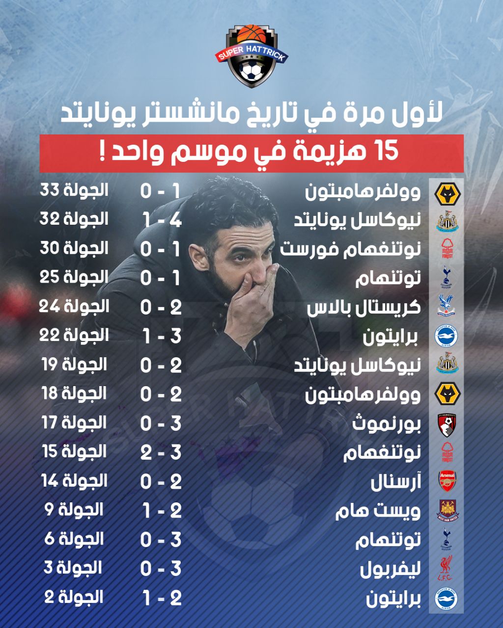 أرقام كارثية لمانشستر يونايتد في الدوري الإنجليزي، تلقى مانشستر يونايتد هزيمته الـ15 في البريميرليغ هذا الموسم، لتكون تلك المرة الأولى في تاريخه بالدوري الإنجليزي الممتاز التي يتعرض فيها لـ15 هزيمة في موسم واحد.