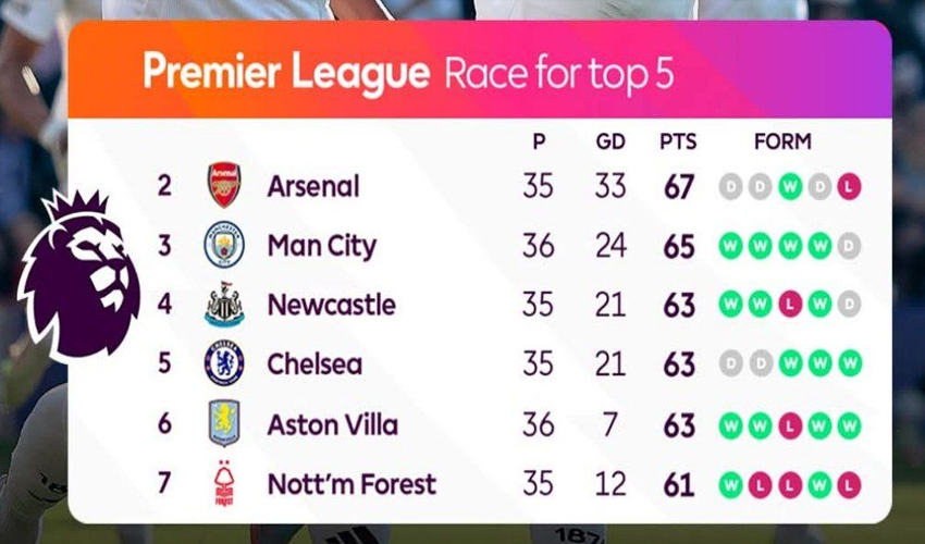 وبالتالي سنشهد مشاركة 6 عمالقة من البريميرليغ في دوري أبطال أوروبا للموسم القادم، واشتعال الصراع في المراكز الخمسة الأولى مع الجولات الثلاث الأخيرة الأخيرة :