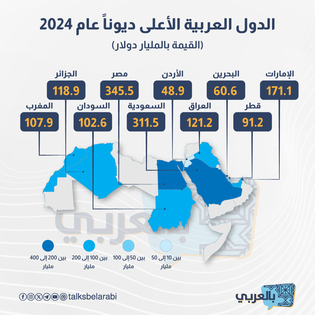 الدول العربية الأعلى ديوناً للعام 2024 تصدرت مصر قائمة الدول العربية الأعلى ديوناً في العالم 2024، بواقع 345.5 مليار دولار، بينما جاءت الأردن في آخر القائمة من حيث قيمة الديون المترتبة عليها بواقع 48.9 مليار دولار عدد الزوار 12 مايو 22, 2025 مواضيع ذات صلة 23 مليار درهم قيمة أصول «مساكن دبي ريت» ... ديسمبر 4, 2025 وكالة الفضاء الأوروبية تنشر صورا ... ديسمبر 4, 2025 مصر تقدم جديد أسلحتها في “إيديكس ... ديسمبر 4, 2025 آخر الأخبار ياسمين عبد العزيز تكشف المستور في ...... Majdolen Moamar | ديسمبر 4, 2025 23 مليار درهم قيمة أصول «مساكن دبي ريت» ...... Majdolen Moamar | ديسمبر 4, 2025 وكالة الفضاء الأوروبية تنشر صورا ...... Majdolen Moamar | ديسمبر 4, 2025 الأكثر قراءةعدد الجالية ذات الأصول العربية في أمريكا 2024 أكتوبر 8, 2024 محمود نصر الوجه الإعلاني للمدرسة السورية الذكية أغسطس 23, 2023 أجور الفنانين السوريين عن مختلف أعمالهم أكتوبر 25, 2023 تواصل معنا