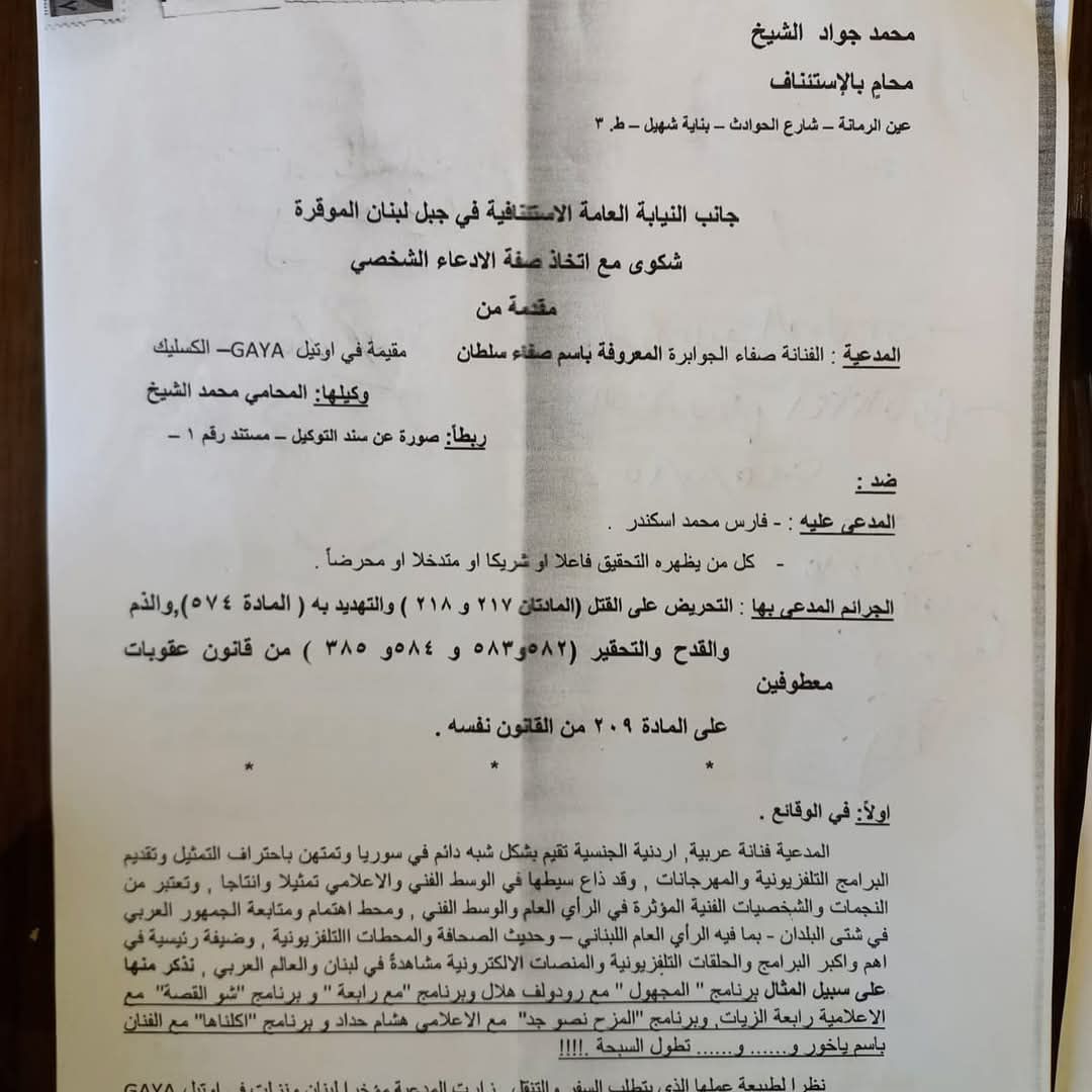 الفنانة “صفاء سلطان” تقاضي الفنان اللبناني “فارس اسكندر” وتعلق: “لقد انتهى زمن السكوت عن الحق، لأنه عندما سكت أهل الحق عن الباطل توهّم أهل الباطل انهم على حق.. لقد تقدمت بتاريخ 15/5/2025 بواسطة وكيلي القانوني المحامي “محمد جواد الشيخ” بشكوى جزائية ضد من تطاول واعتدى وافترى زوراً على كرامتي وشرفي وسمعتي، واتهمني باتهامات باطلة جملة وتفصيلاً، والقضاء هو الفيصل بيننا”.