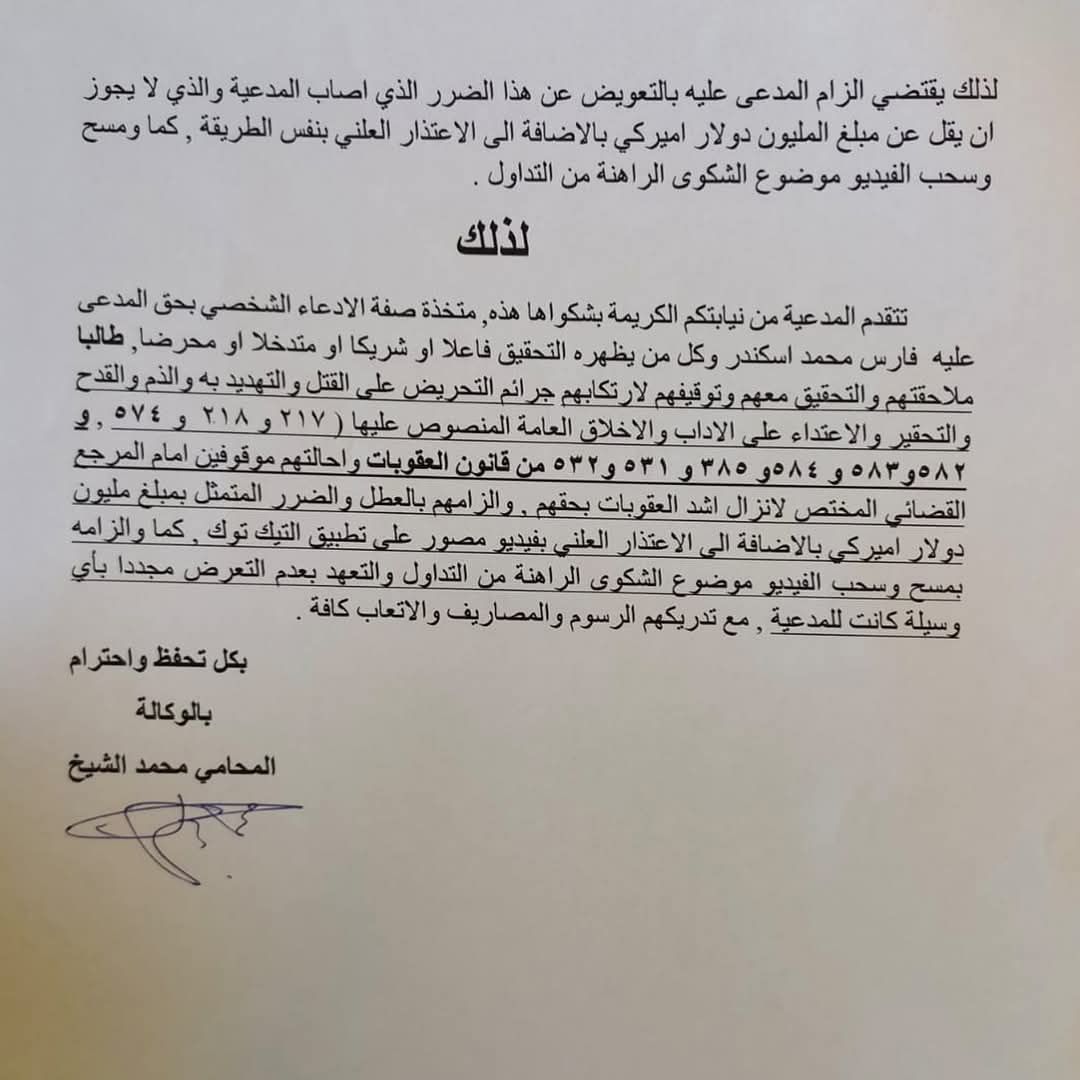 على ذلك قررت “صفاء” اللجوء إلى القضاء، مؤكدة أن ما بدر من “إسكندر” لا يدخل ضمن حرية الرأي، بل ضمن التحريض والتشهير والتهديد بالقتل، وتنتظر حالياً، المسار الذي ستأخذه القضية في أروقة المحاكم اللبنانية.