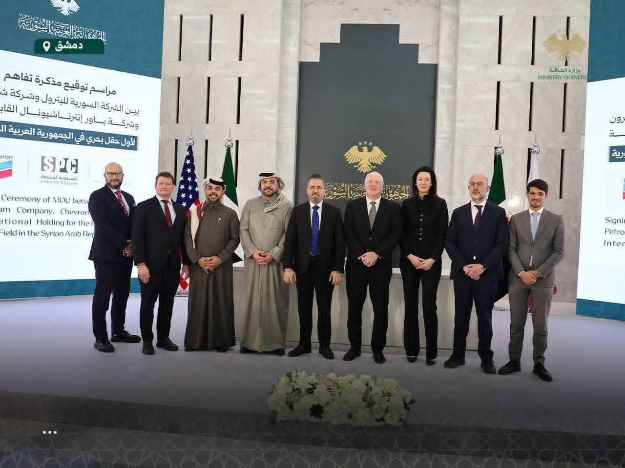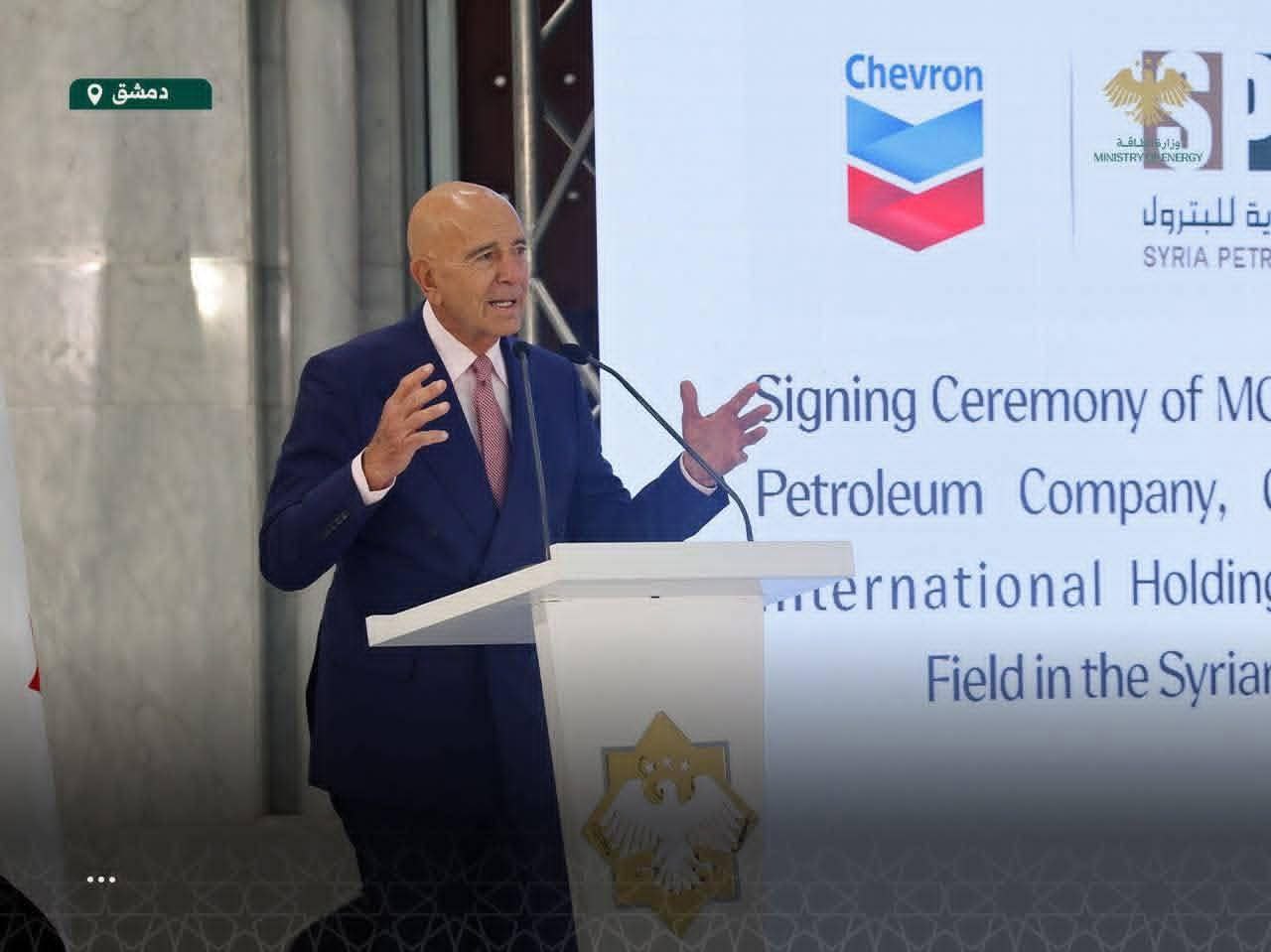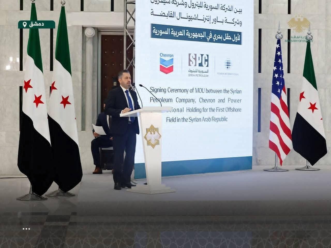 جرى أمس في قصر الشعب بدمشق توقيع مذكرة تفاهم بين الشركة السورية للبترول وكلٍّ من شركة شيفرون الدولية وشركة باور إنترناشيونال القابضة، وذلك في إطار التوجّه نحو استثمار أول حقل بحري في الجمهورية العربية السورية، بحضور المبعوث الأمريكي إلى سورية توم برّاك.